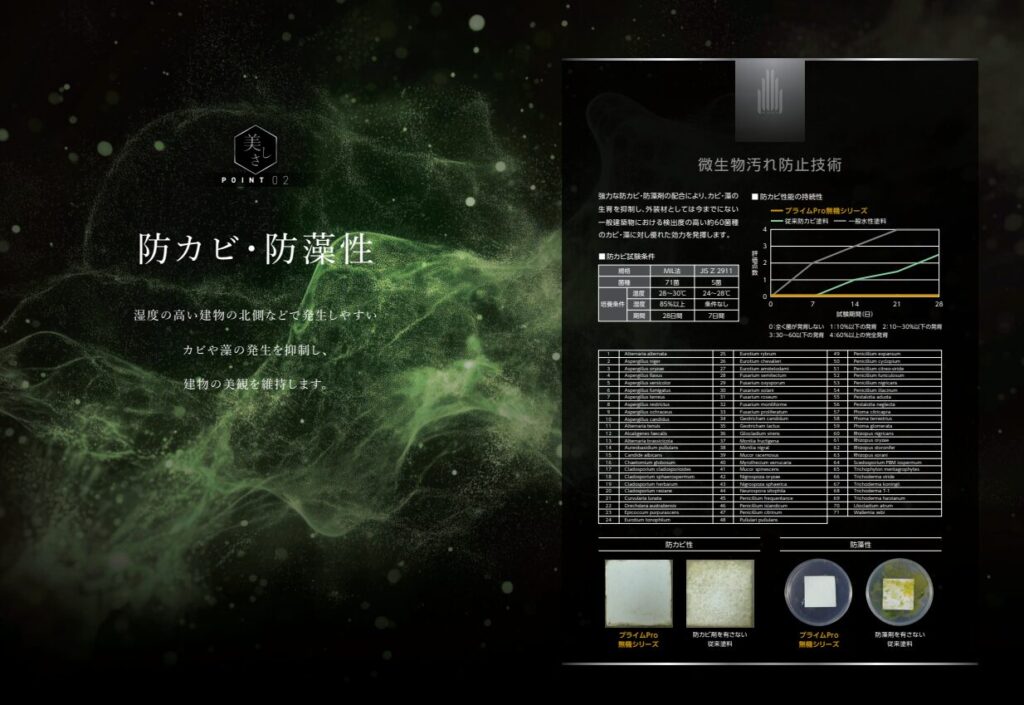 外装材としては今までにない一般建物における検出度の高い約60階種のカビ・薬に対し優れた効力を発揮します。