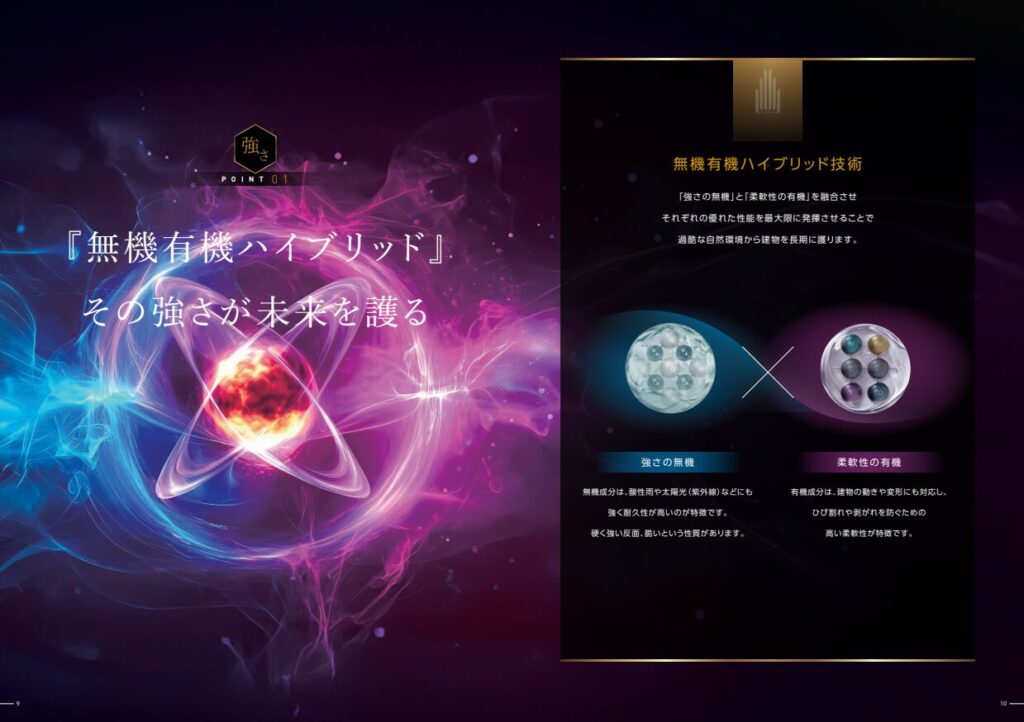 | 無機成分は、酸性雨や太陽光(紫外線)などにも強く、耐久性が高いのが特徴です! 硬く強い反面、脆いという性質があります😢 | 有機成分は、建物の動きや変形にも対応し、ひび割れや剥がれを防ぐための高い柔軟性が特徴です😊 |