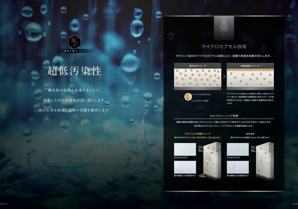 | 耐久性向上 | 汚れによる劣化を防ぎ、塗膜の耐久性を高めます。 超低汚染性は、建物の美観とメンテナンス性を両立させるための重要な性能です。特に、排気ガスや塵埃の影響を受けやすい都市部や、降雨量の少ない地域でその効果を発揮します。 |