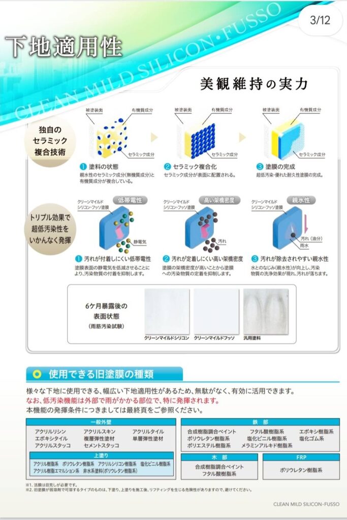 さらに、高い耐候性を有しており、様々な建物・部位に塗布が可能な万能型塗料です。