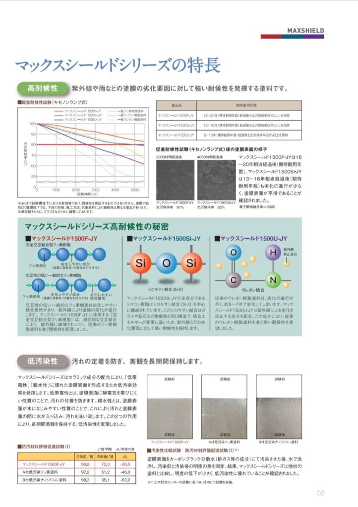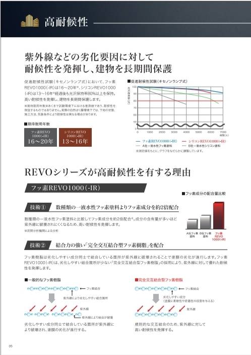 自然環境における紫外線・雨・ 熱などの劣化要因に対して高の汚れに対する耐候性を発揮」し、