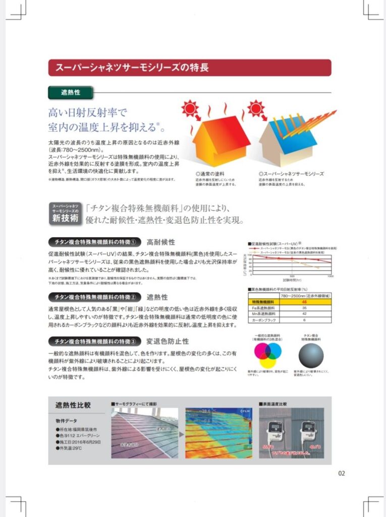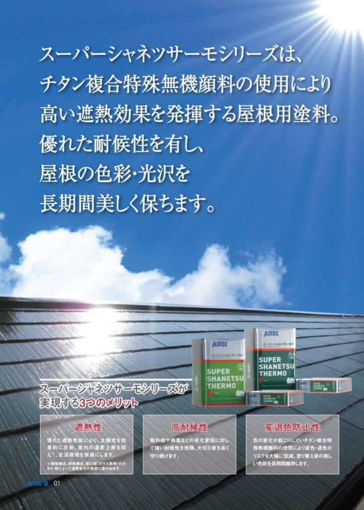 スーパーシャネツサーモシリーズは、チタン複合特殊無機顔料の使用により高い遮熱効果を発揮する屋根用塗料。