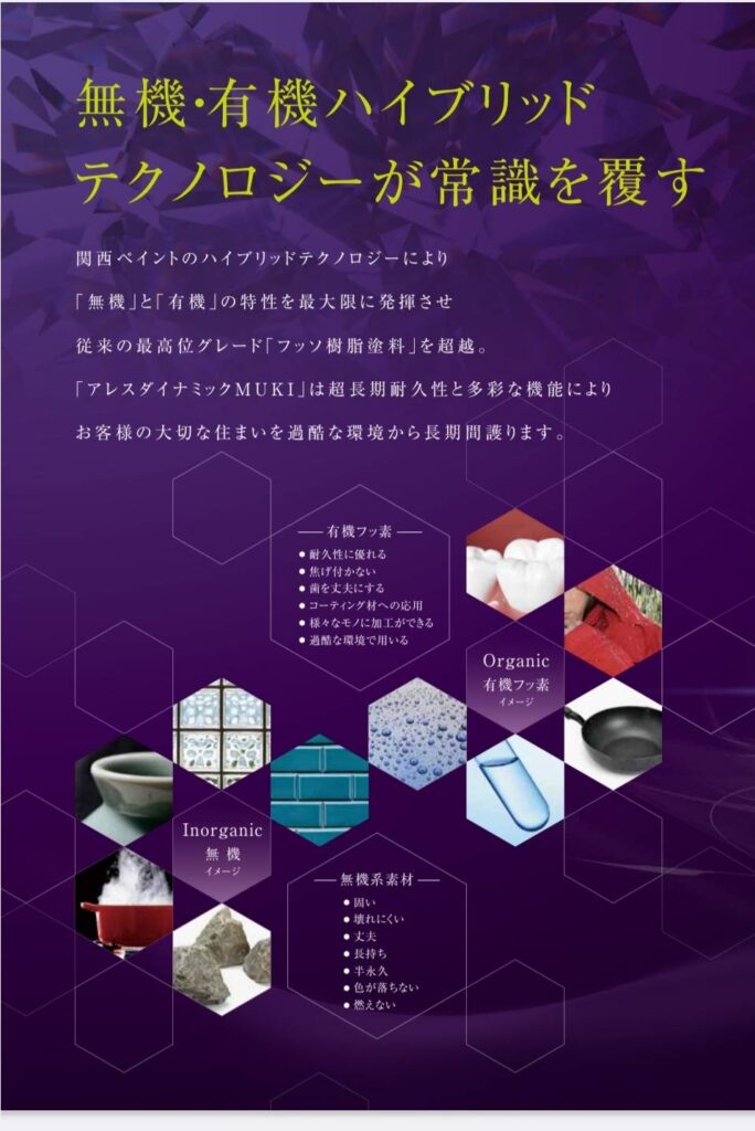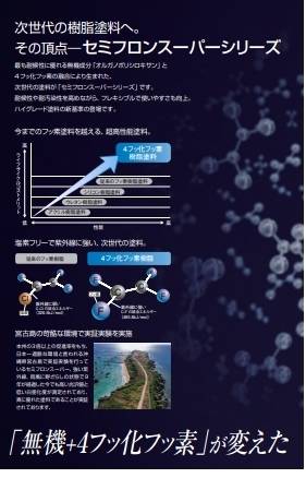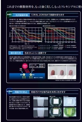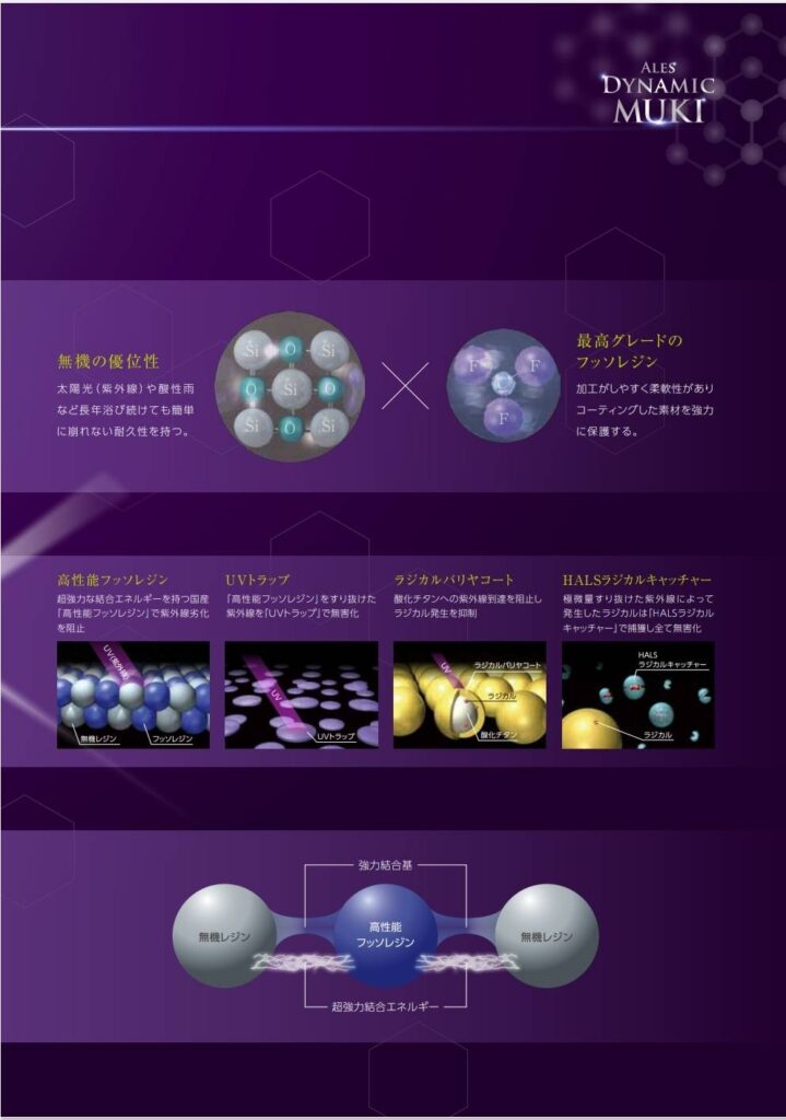 「無機」の強靭さと「有機」の柔軟性、そしてフッソレジンの素材の保護機能を高効率で配合させることで優れた耐候性を発揮。