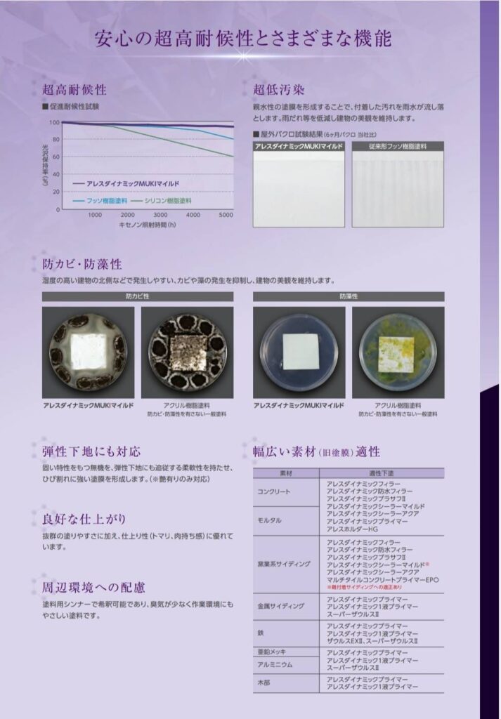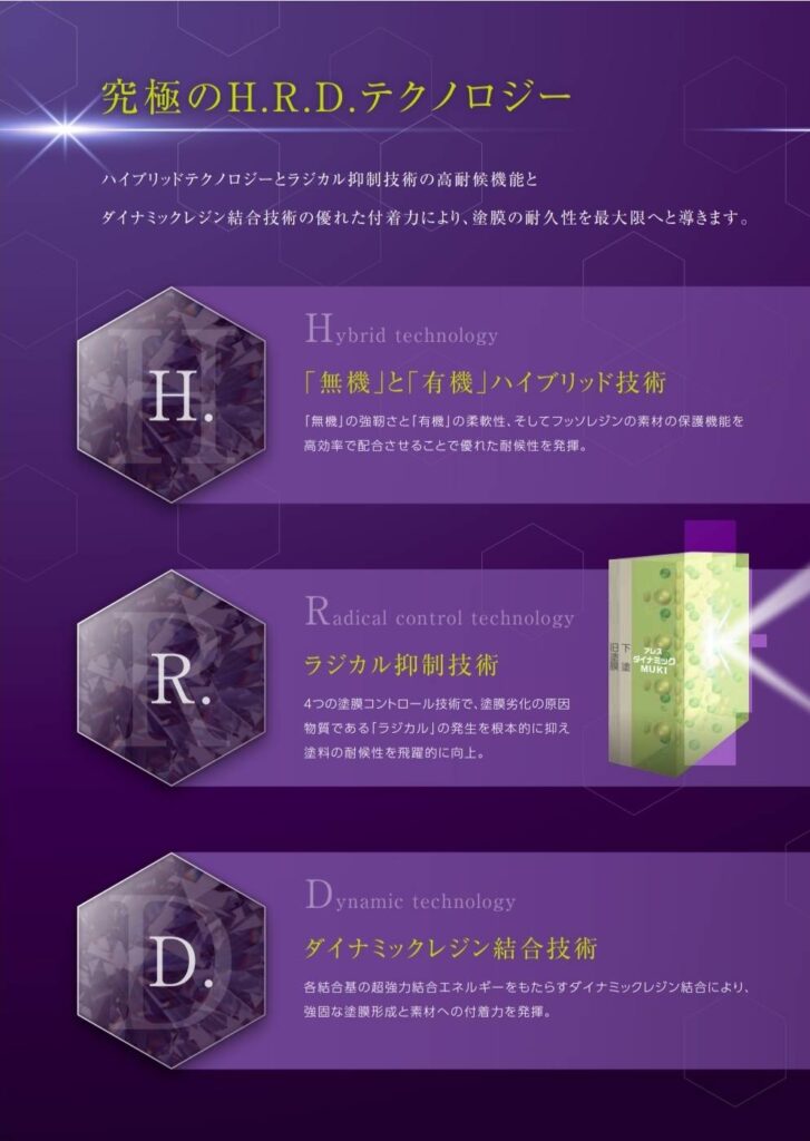 ハイブリッドテクノロジーとラジカル抑制技術の高耐候機能とダイナミックレジン結合技術の優れた付着力により、
