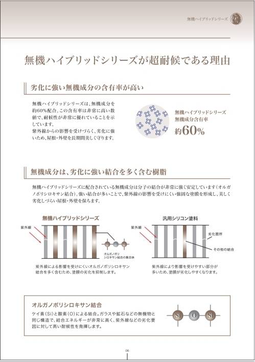 シロキサン結合のポリマー育格をもつ無機有機複合塗料です。無機ケイ素化合物は化学的・物理的に安定なことから耐候性・耐汚染性に優れる新世代塗料の材料です。