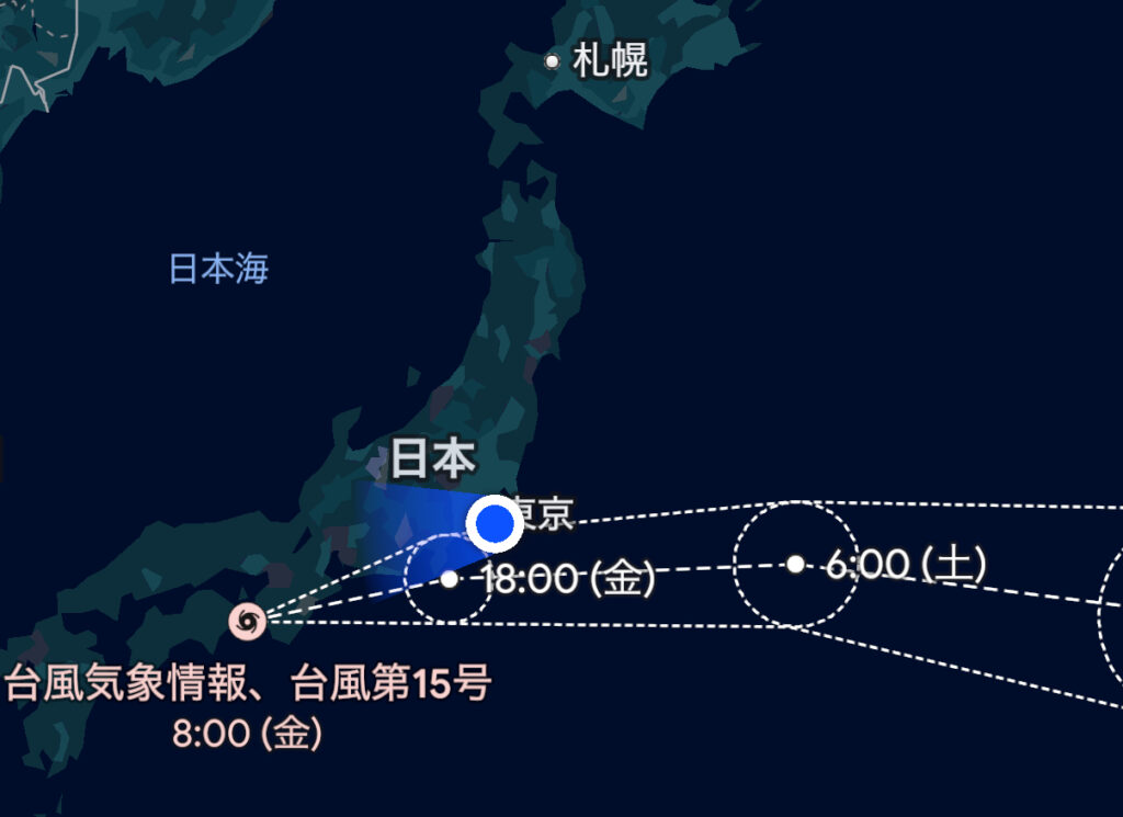 台風第15号は、5日6時には、安芸市付近にあって、1時間におよそ25キロの速さで東北東へ進んでいます。中心の気圧は1000ヘクトパスカル、中心付近の最大風速は18メートル、最大瞬間風速は25メートルとなっています。台風は今後、西日本から東日本の太平洋側を東へ進み、関東甲地方には5日午後に最も接近する見込みです。
