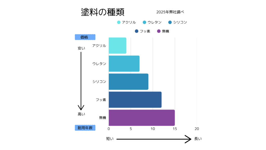 外壁塗装の耐久性は、塗料の種類によっても大きく左右されます😢