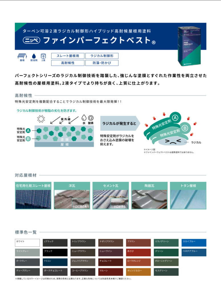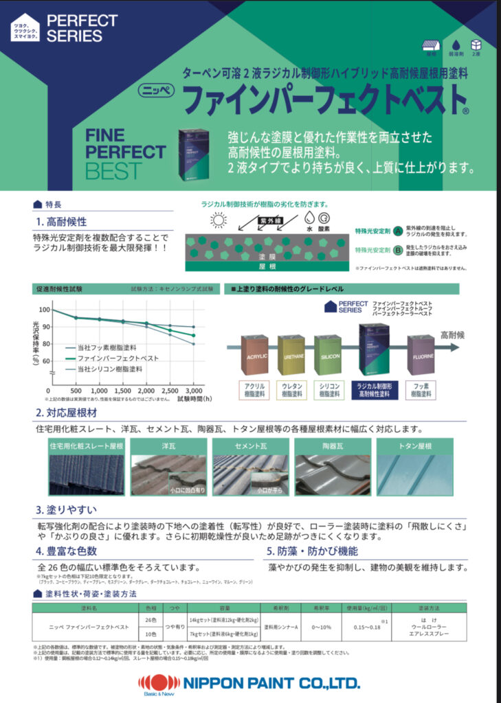 フッ素櫢脂塗料を超える高耐候性を誇るハイグレードの屋根用塗料です。