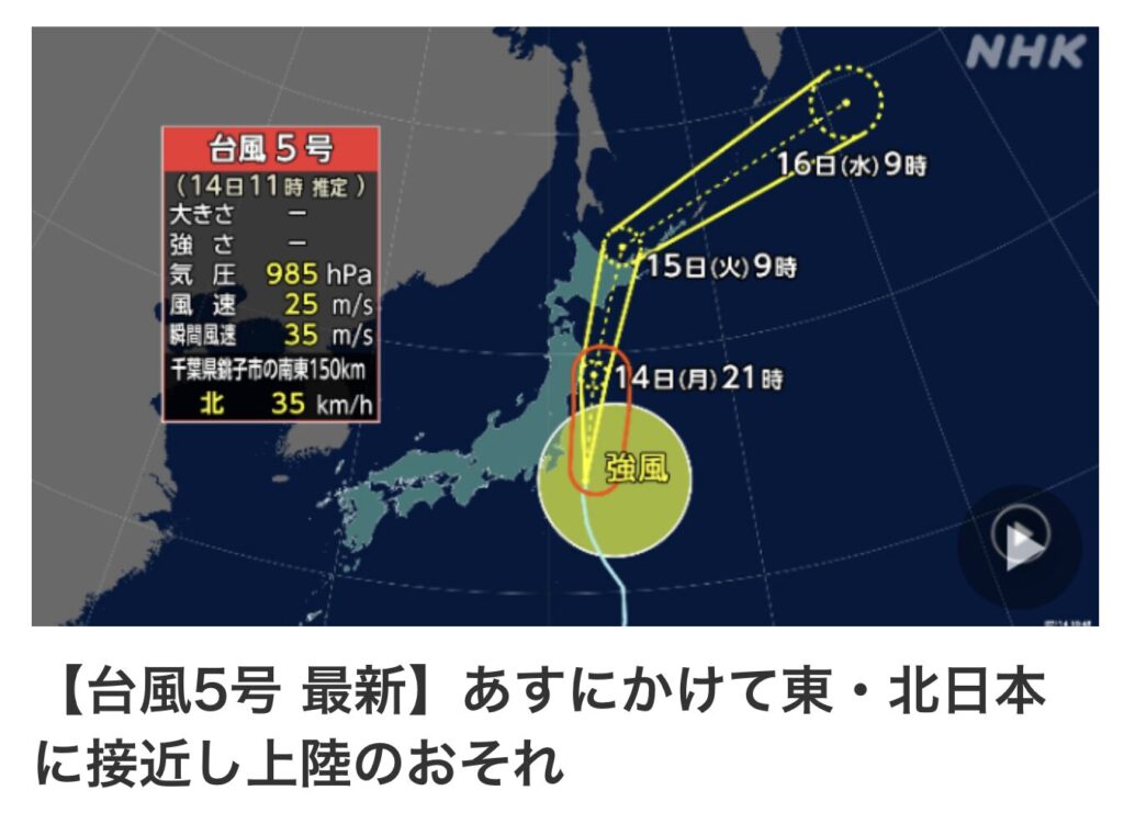 台風5号は関東の南東の海上を北上し、あすにかけて東日本や北日本に接近し上陸するおそれがあります。暴風や高波に警戒するとともに土砂災害などに十分注意が必要です。