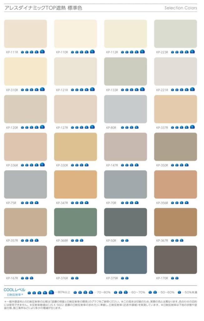 上塗の「アレスダイナミックTOP遮熱」は、特殊顔料を使用しているためどの色でも、