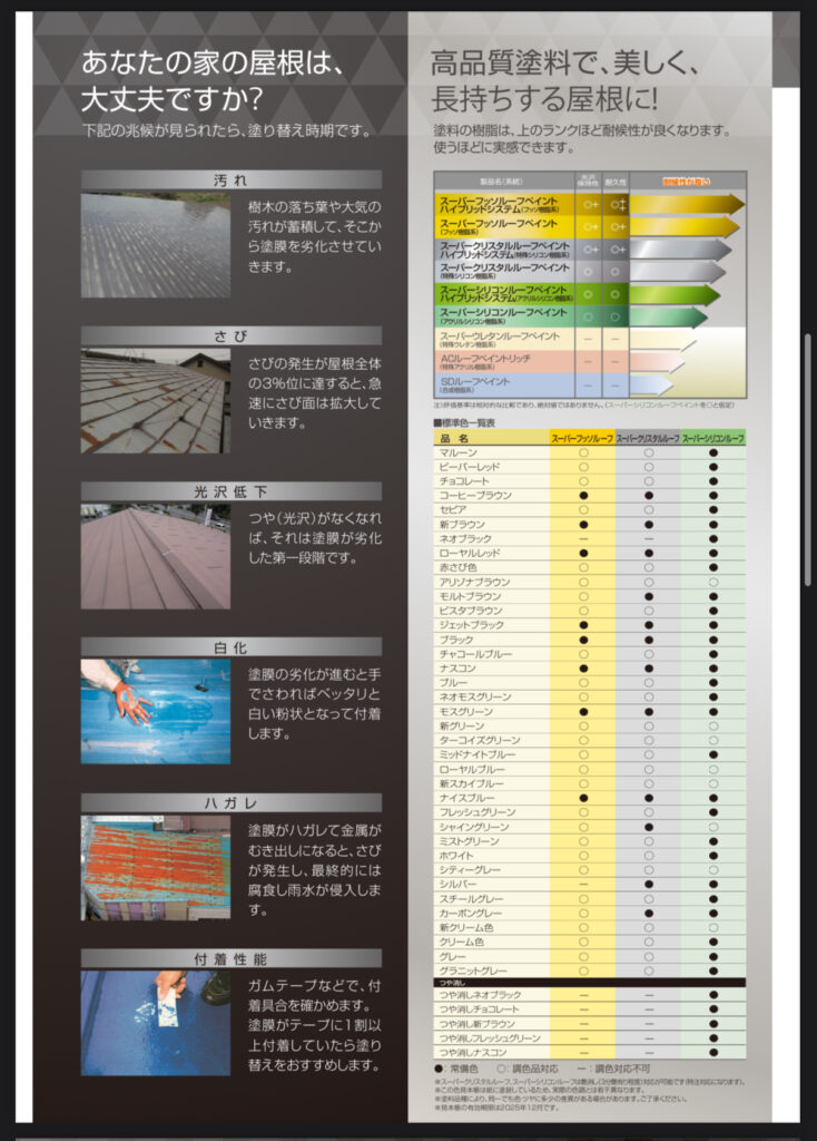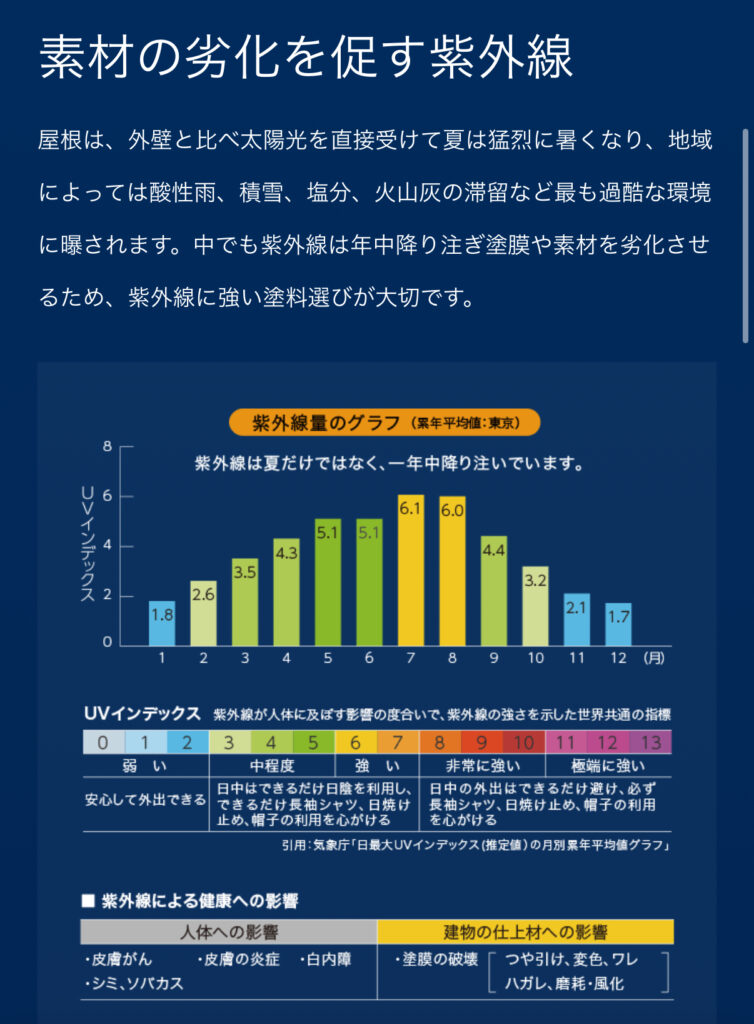 屋根は、外壁と比べ太陽光を直接受けて夏は猛烈に暑くなり、地域によっては酸性雨、積雪、塩分、火山灰の滞留など最も過酷な環境に曝されます。中でも紫外線は年中降り注ぎ塗膜や素材を劣化させるため、紫外線に強い塗料選びが大切です。