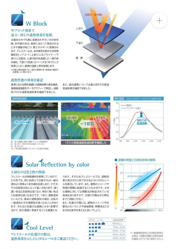 遮熱機能を有し、屋根の表面温度、室内温度の低減に効果があります。