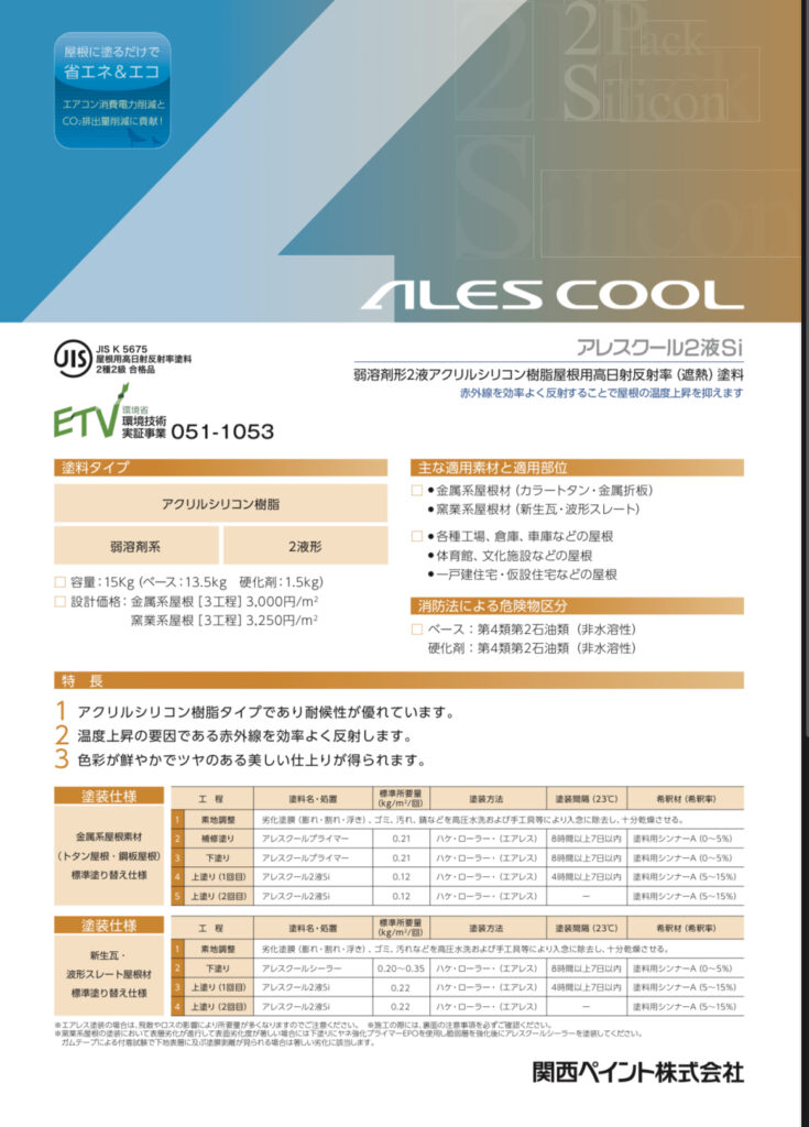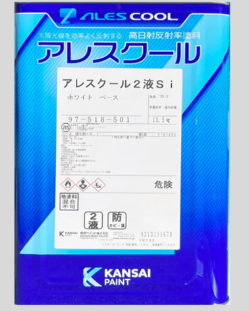 ・弱溶剤形2液アクリルシリコン樹脂屋根用高日射反射率(遮熱)塗料です。