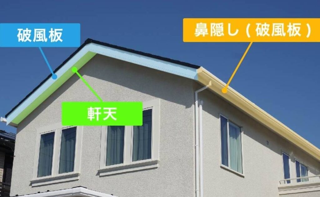 破風は「はふ」と読み、三角屋根(切り妻屋根)の妻側(横から見て三角部分)部分を指します。鼻隠しとは「はなかくし」と読み、屋根の軒先部分、雨樋が取り付けられている下地部分を指します。