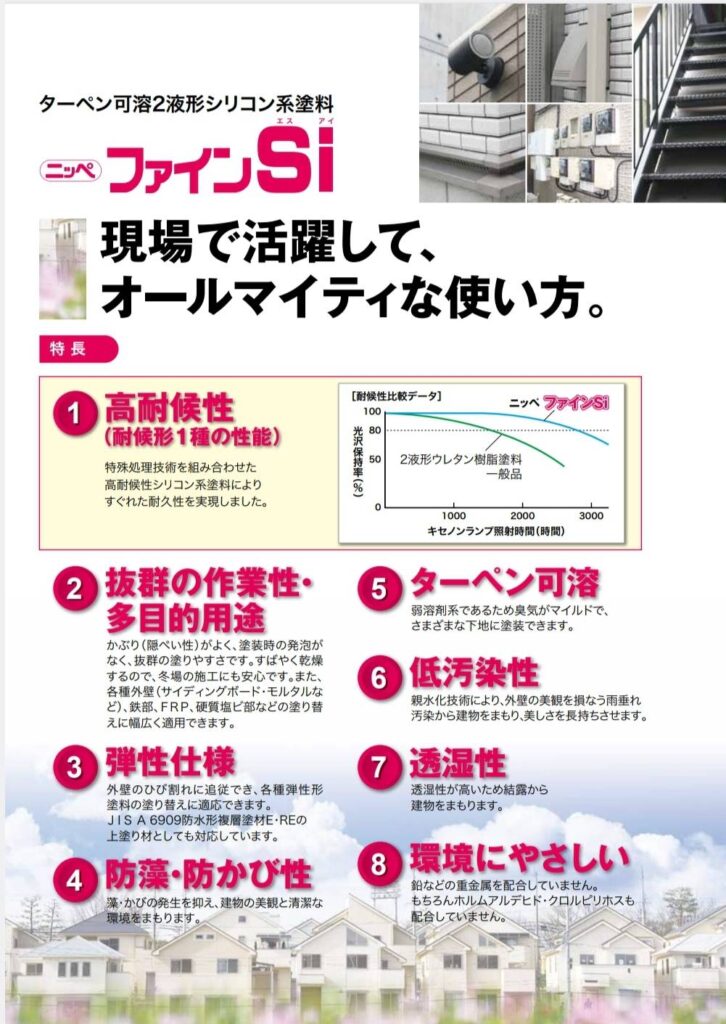 シリコン樹脂を使用しているため耐久性が高くフッ素樹脂系塗料に次いで耐候性や光沢保持性に優れています。