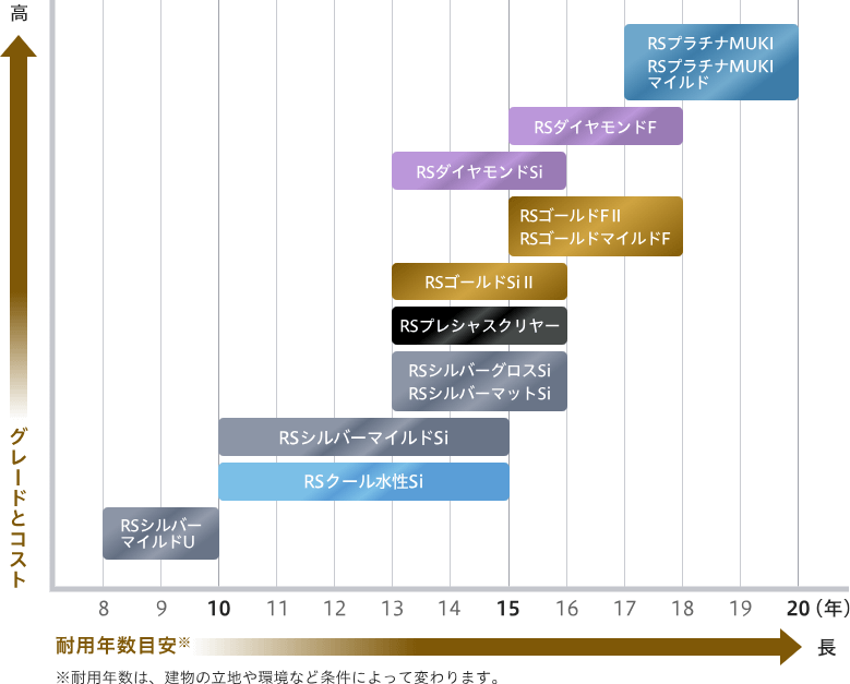 フッ素・無機グレードの塗料は、耐久年数が15年以上もつものが多く、また、汚れにくさなどでもシリコンよりも優れているものがほとんどです。
