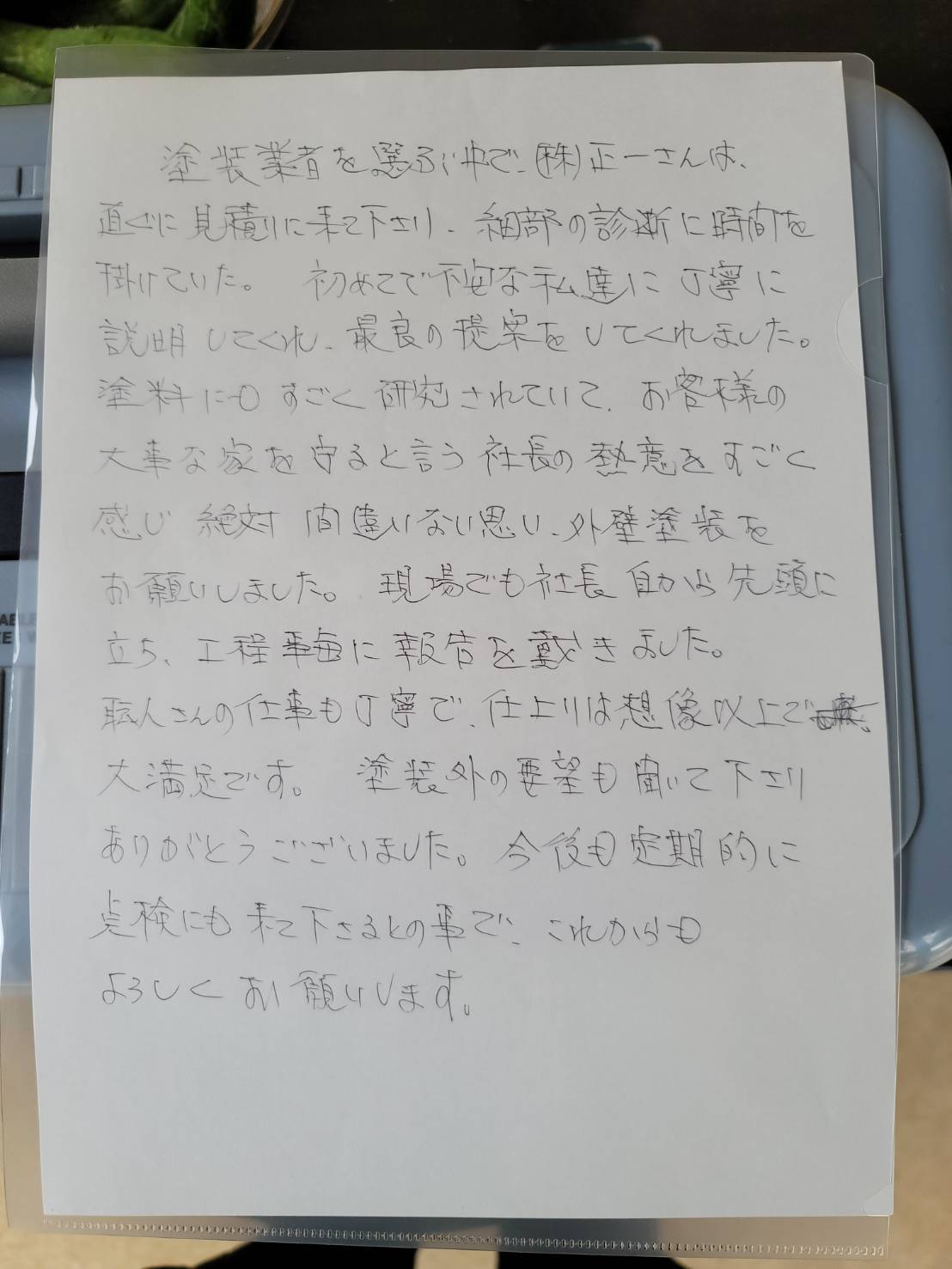 塗料をものすごく研究されていて、お客様の大事な家を守ると言う社長の誠意をすごく