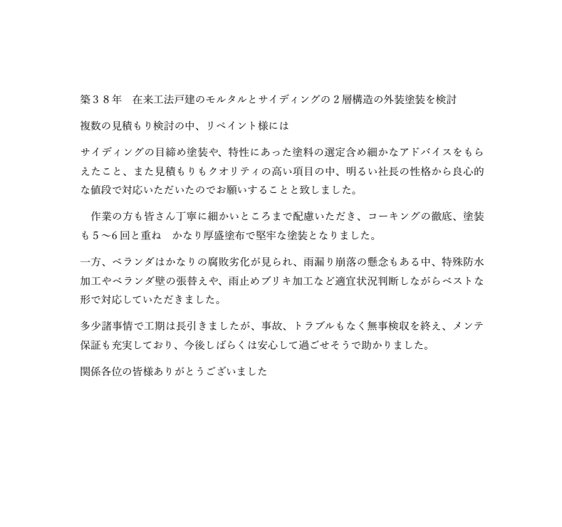 サイディングの目締め塗装や、特性にあった塗料の選定含め細かなアドバイスをもらえたこと、また見積もりもクオリティの高い項目の中、明るい社長の性格から良心的な値段で対応いただいたのでお願いすることと致しました。