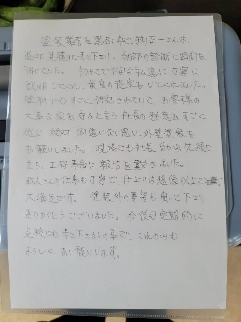 千葉県市原市Y様邸 お客様アンケート 塗料をものすごく研究されていて、お客様の大事な家を守ると言う社長の誠意をすごく感じ絶対間違いないと思い、外壁塗装をお願いしました。 現場でも社長自ら先頭に立ち、工程毎事に報告を戴きました。 職人さんの仕