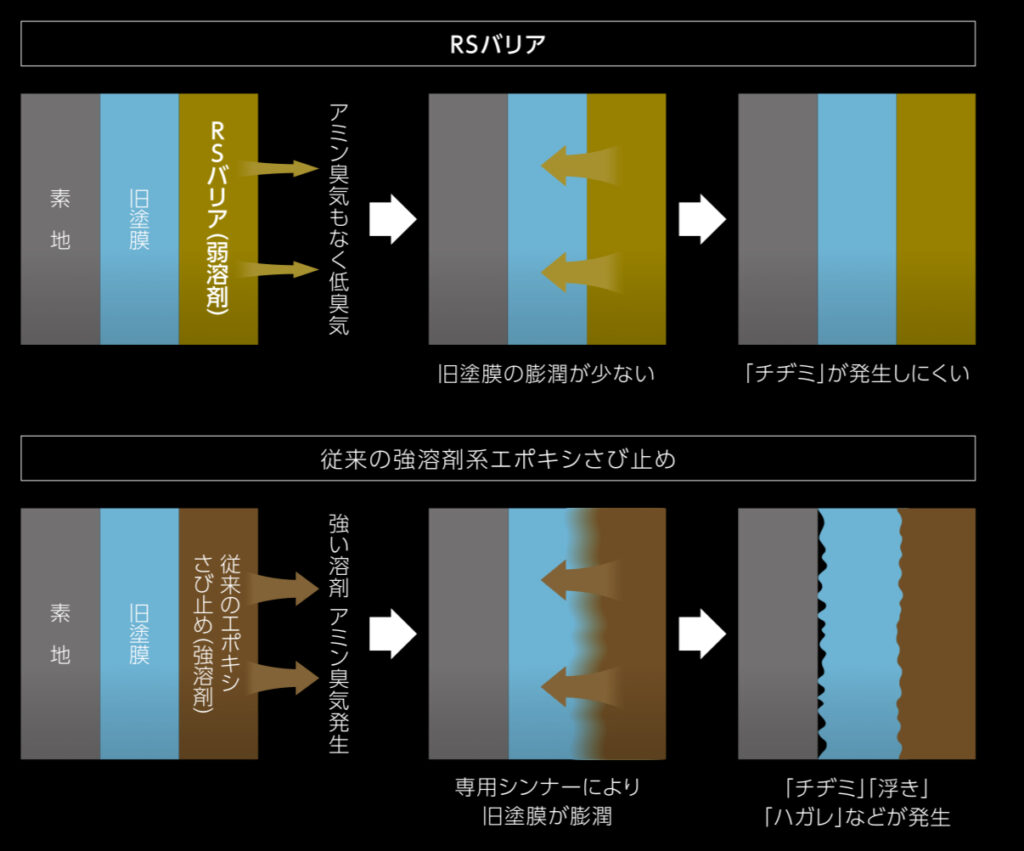 関西ペイントRSバリアは、旧塗膜の膨潤が少なく、